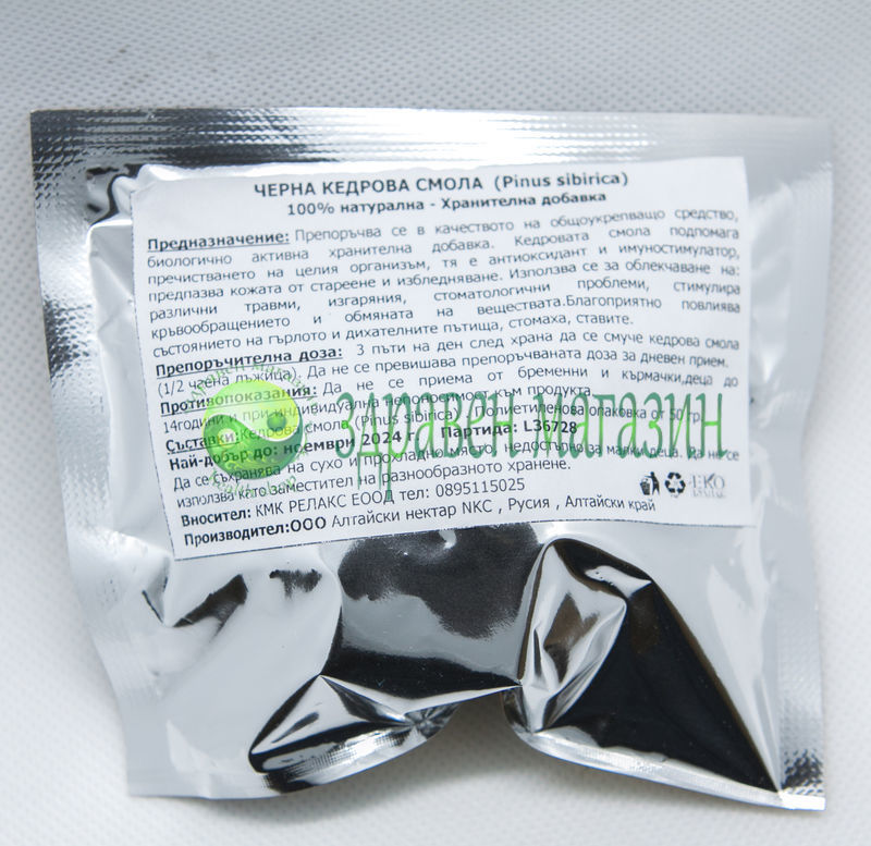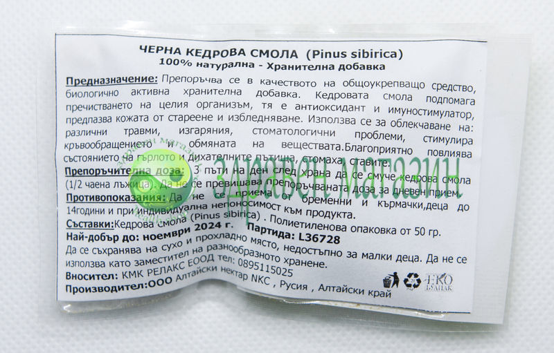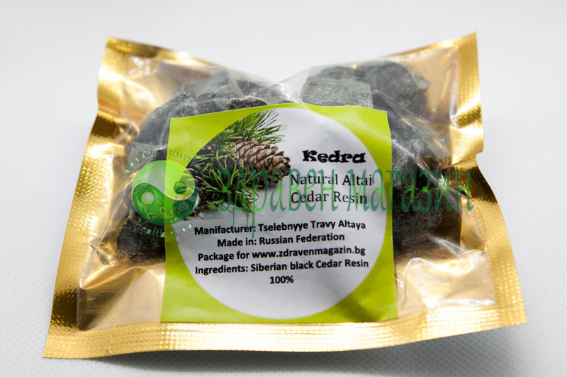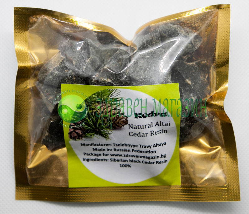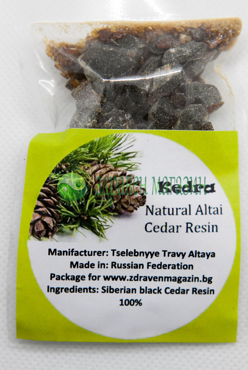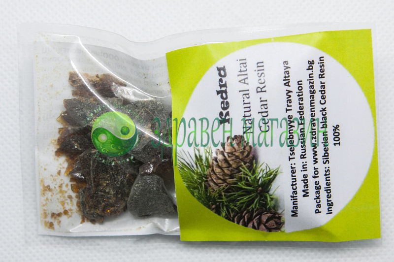СъставкиКедрова смола (Pinus sibirica). Полиетиленова опаковка от 10 г.